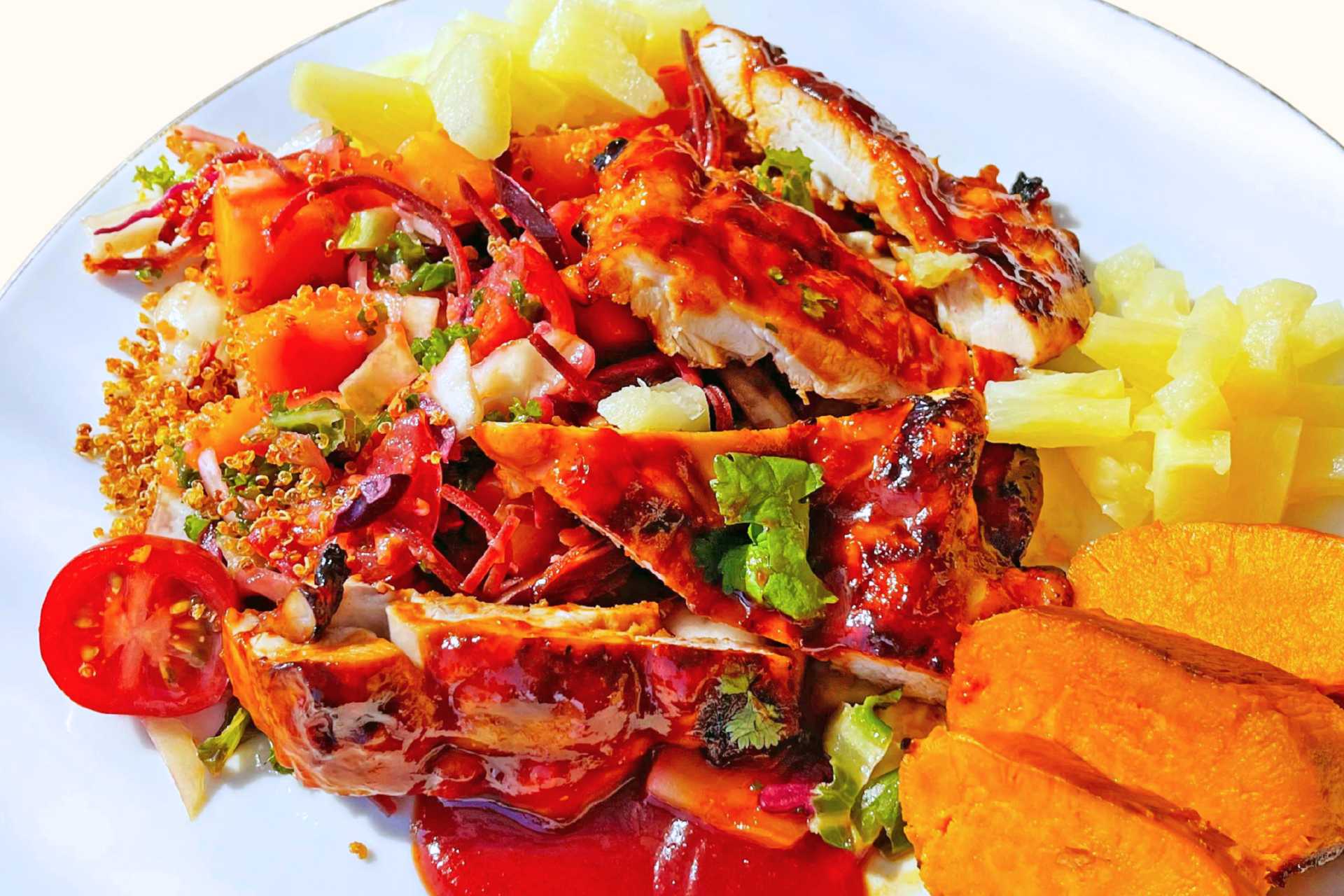 Sticky BBQ kylling m/ tropisk salat & crispy quinoa